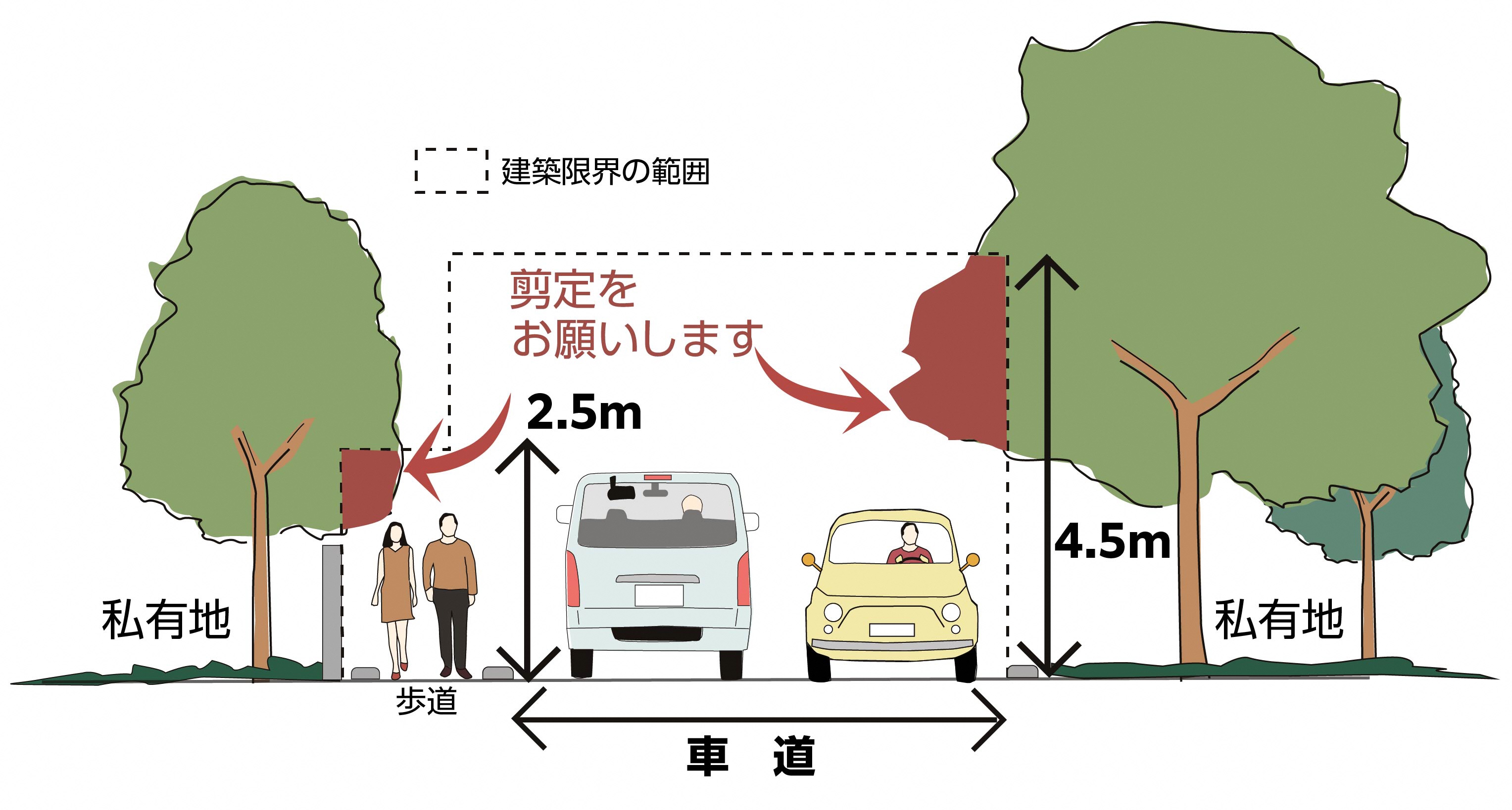 町では町道に張り出している樹木に関して、現況を確認し、状況に応じて土地所有者に指導を行うことがあります。私有地に生垣や樹木等を所有されている方は、建築限界【※図1】を守り適切な管理をお願いします。