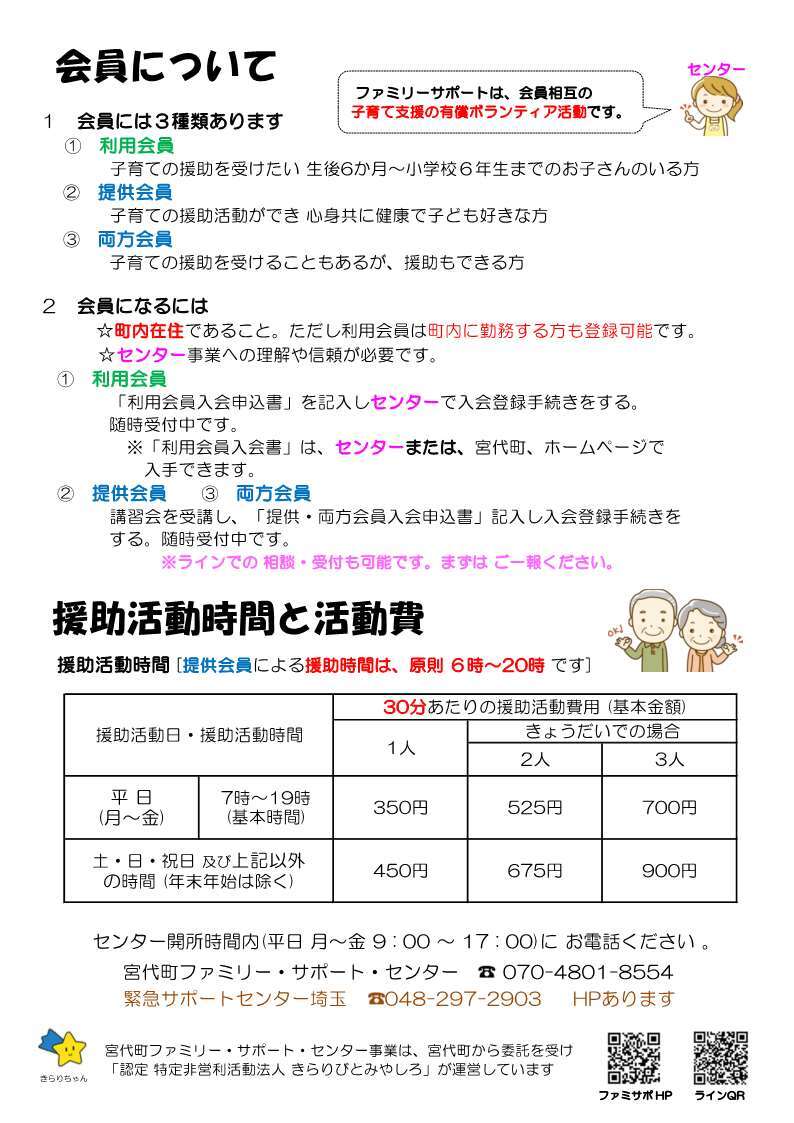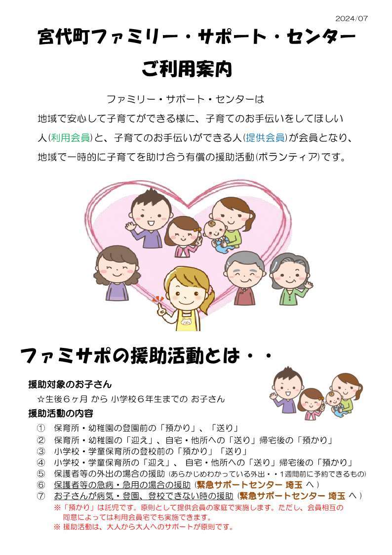 宮代町では、平成30年7月から、ファミリー・サポート・センター事業を特定非営利活動法人「きらりびとみやしろ」に、緊急サポートセンター事業を「病児保育を作る会」に委託し、実施しています。
