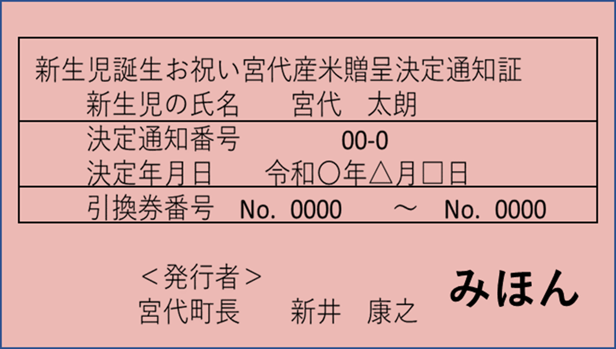 町では、宮代産米の消費拡大・地産地消の推進と子育て世帯への応援のため、お子さんの誕生のお祝い品として「みやしろ産米」を贈呈します。