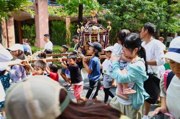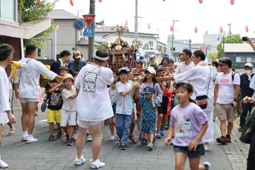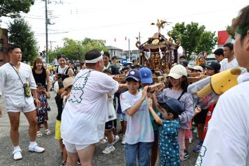 いよいよ開会式が始まり、町民まつり大会会長である新井町長が挨拶。続いて実行委員長の開会宣言。そして、町制施行70周年を記念して復活させた子ども神輿をみんなで担いでもらいたいと司会者から参加の要請がありました。周りにいる子どもたちも一緒に加わって、神輿を担いでスキップ広場を出発。庁舎間道路を練り歩き、第42回宮代町民まつりは始まりました。