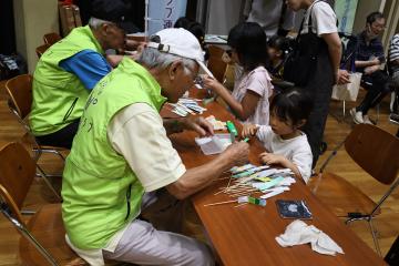 大ホールでは、「さわやかクラブ連合会」が竹トンボならぬ紙トンボや、マグダーツやバッゴーといったイベントを実施。紙トンボを作っていた親子は、「以前、子育て広場で紙トンボを作った。ボロボロになってしまったのでまた作りに来ました。」と言って、出来上がった紙トンボをスタッフと一緒に飛ばしていました。