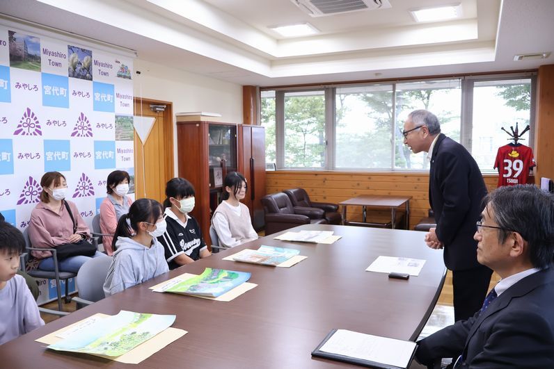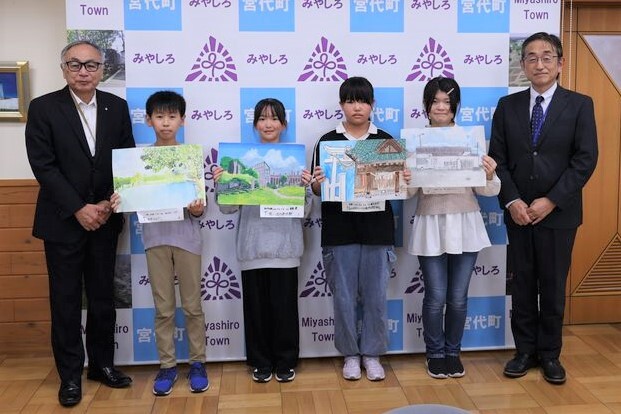 10月20日に絵画コンテストの最優秀賞授賞式が行われ、新井町長から表彰状、島村教育長から記念品が授与されました。受賞された皆さんから「葉はそれぞれ色が違うので、色を変えたり影を付けて工夫した」「進修館は形が変わっているので、書くのが大変だった」「昔の建物は壁の色を濃くした」「普段使う身近な施設を描いた」など、作成時を振り返りいろいろな感想をいただきました。また、新井町長から「70年を迎えた宮代町が、皆さんの心にどのように映っているのか楽しみにしていました。応募いただいた作品はどれも素晴らしく、選考は本当に大変でした」と話しがありました。