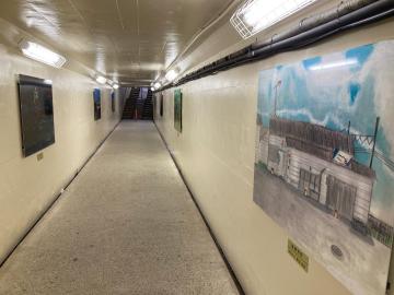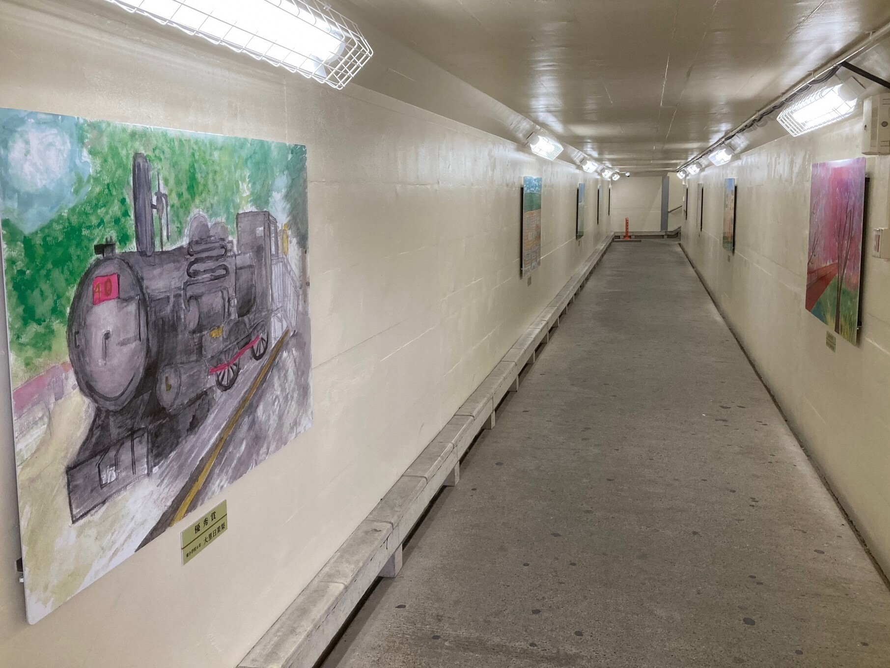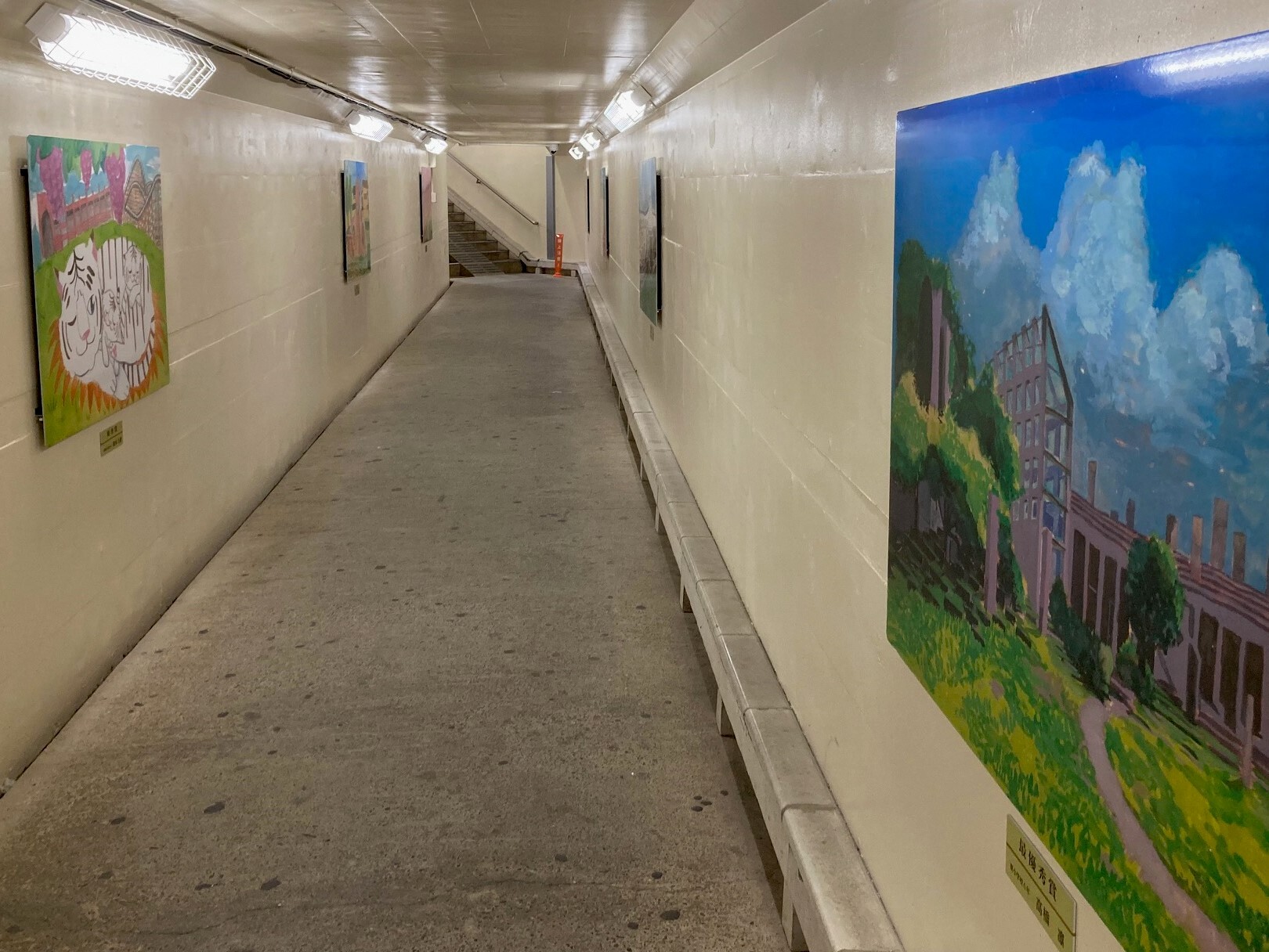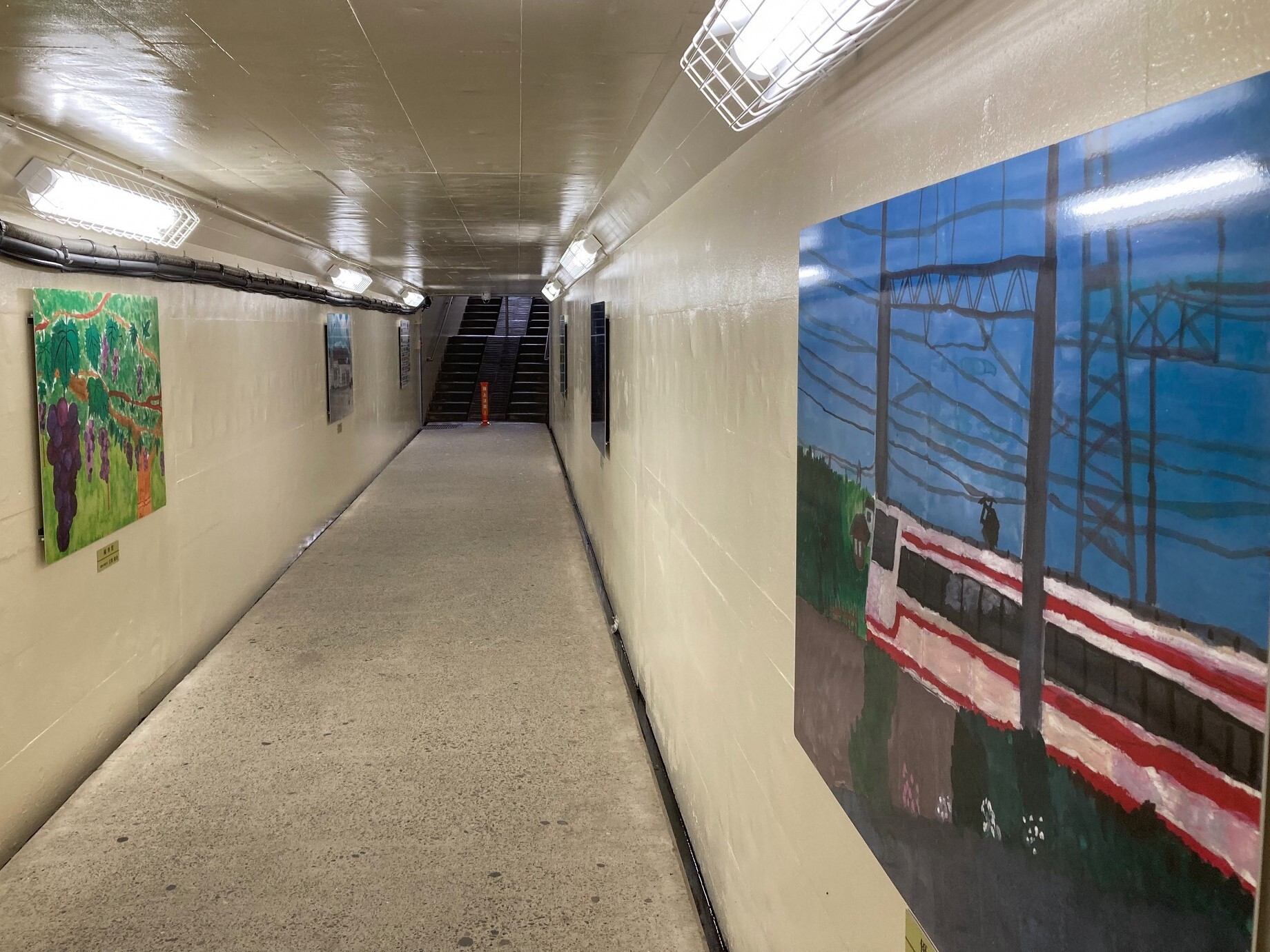「魅力発信の場」のファーストステップとして、地下道の通路空間を利用したアートギャラリーを展開しました。町内小学校の5、6年生から「宮代町の好きな風景」をテーマに絵画の募集を行ったところ、約200点に及ぶ作品が集まりました。どの作品も町への思いが豊かに表現された素晴らしいものでした。最優秀作品と優秀作品は、大きく引き伸ばしたパネルとして展示しています。また、募集いただいた作品すべてを展示しています。ぜひ自分の作品を探してみてください。