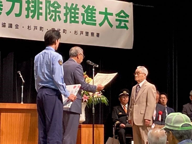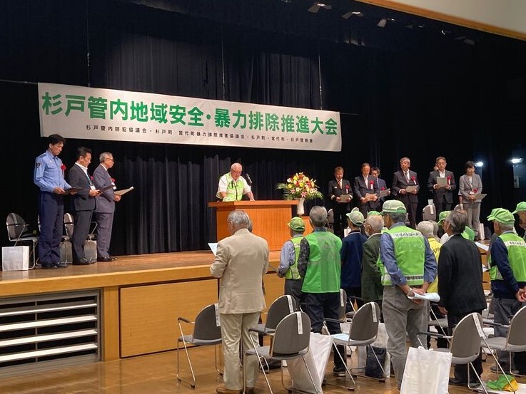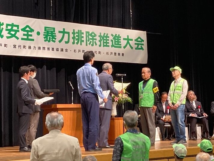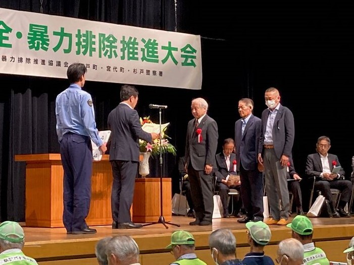 10月10日(金)すぎとピアにおいて「杉戸警察署管内地域安全・暴力排除推進大会」が開催されました。この大会は、地域防犯活動において多大なるご尽力をいただいた方々を表彰するとともに、今後の防犯活動及び暴力排除活動をより一層推進することを目的に実施するものです。宮代町長のあいさつでは「最近はSNSを使った詐欺が多く、警戒を強く呼びかけている。身に覚えの無い着信には絶対に応えないことが大切です」と話しがありました。また、杉戸警察署長のあいさつでは「詐欺グループは暴力団との繋がりがあり、奪ったお金は暴力団に流れていくケースが多い。不審な電話があった場合は、すぐに110番してください」と話しがありました。