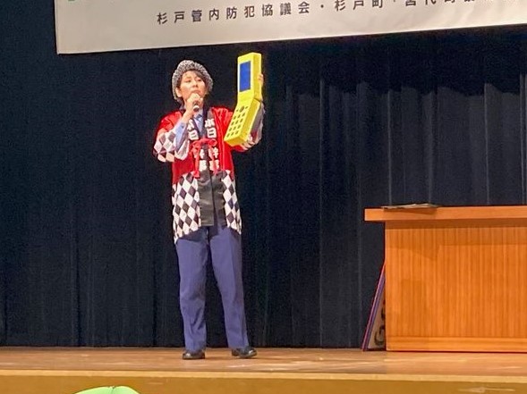 第2部では、埼玉県警察防犯指導班「ひまわり」による寸劇が披露されました。ひまわりは、防犯思想の高揚と犯罪のない明るい地域社会確立のため、県内各地を周り巡回防犯指導を推進しています。この日は、息子を騙ったオレオレ詐欺の寸劇が行われ、詐欺の手口を分かりやすく解説していただいたうえ、「(1)留守番電話機能付電話の設置、(2)在宅中でも留守番電話機能をON!、(3)高額現金を自宅に保管しない」がとても大切とお話しをいただきました。詐欺の被害が後を絶ちません。みなさんお金の絡む話しには十分注意しましょう。