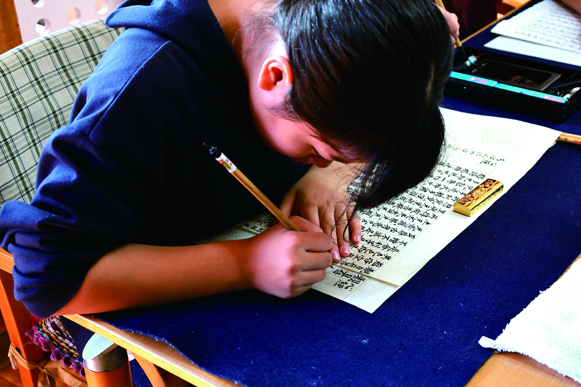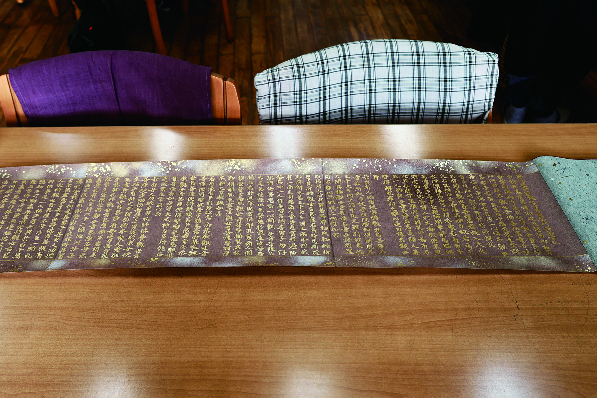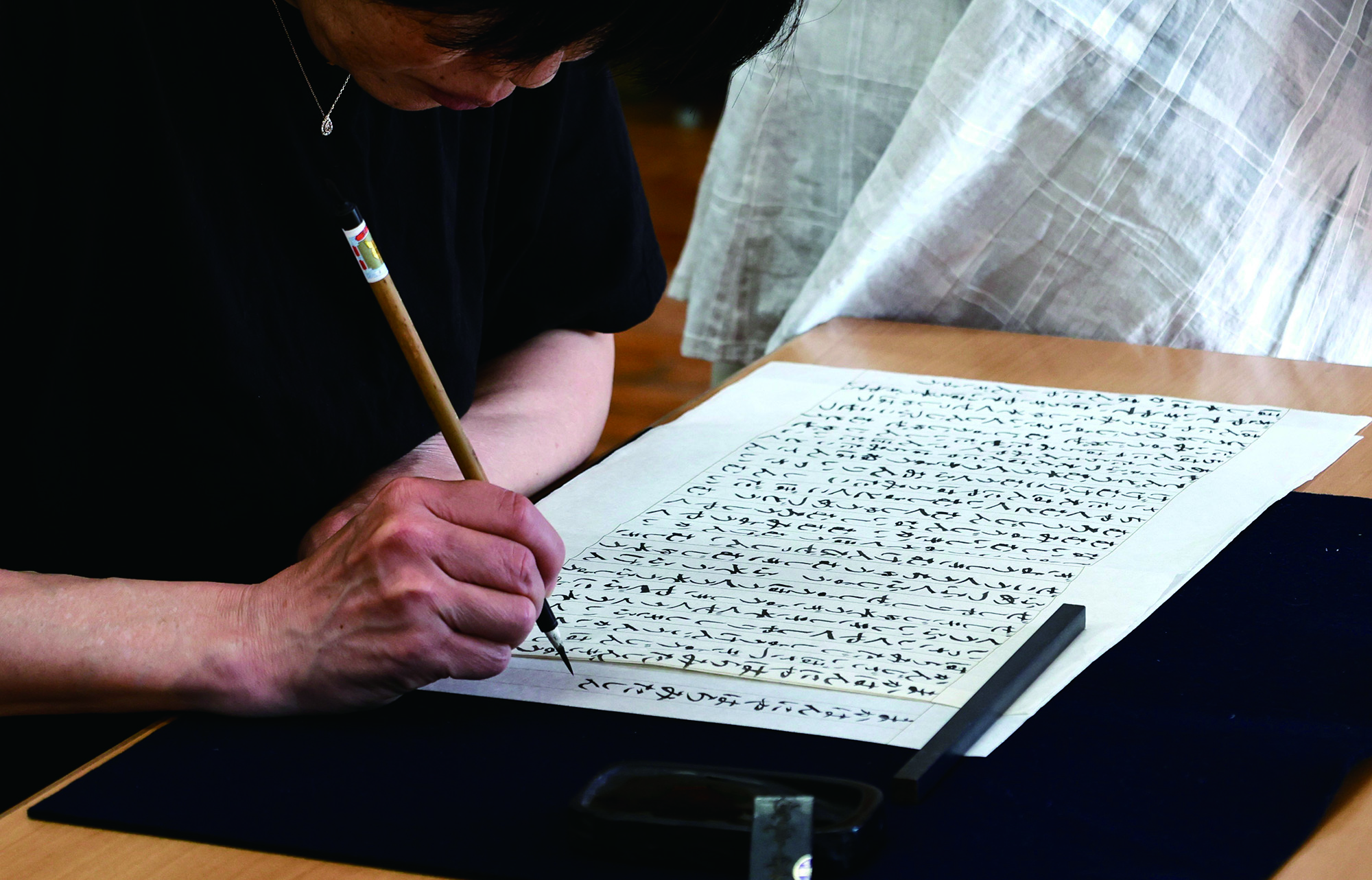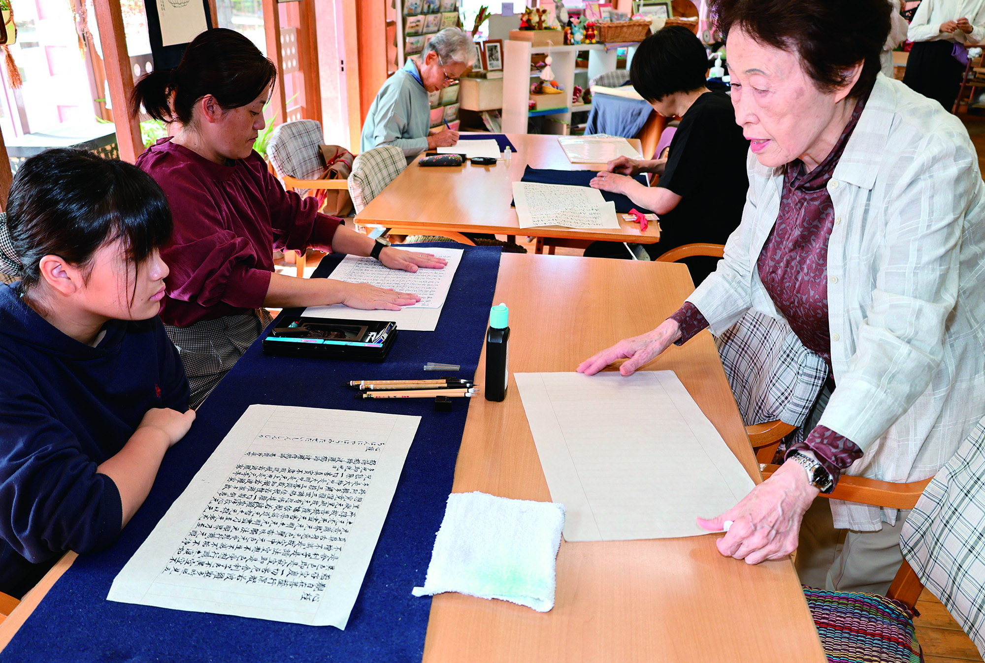 また、お母様の麗子さんは、子どもの頃から家業が仏壇屋さんの友人がいて、写経はその友人の所で見聞きしていたそうです。しかし本格的に始めたのは45歳の頃と言っていました。この道の仕事をしていたわけでもなく、普通の会社に65歳まで勤め、その後、教え始めたということです。麗子さんの作品は、ものすごく目を引くものばかりです。