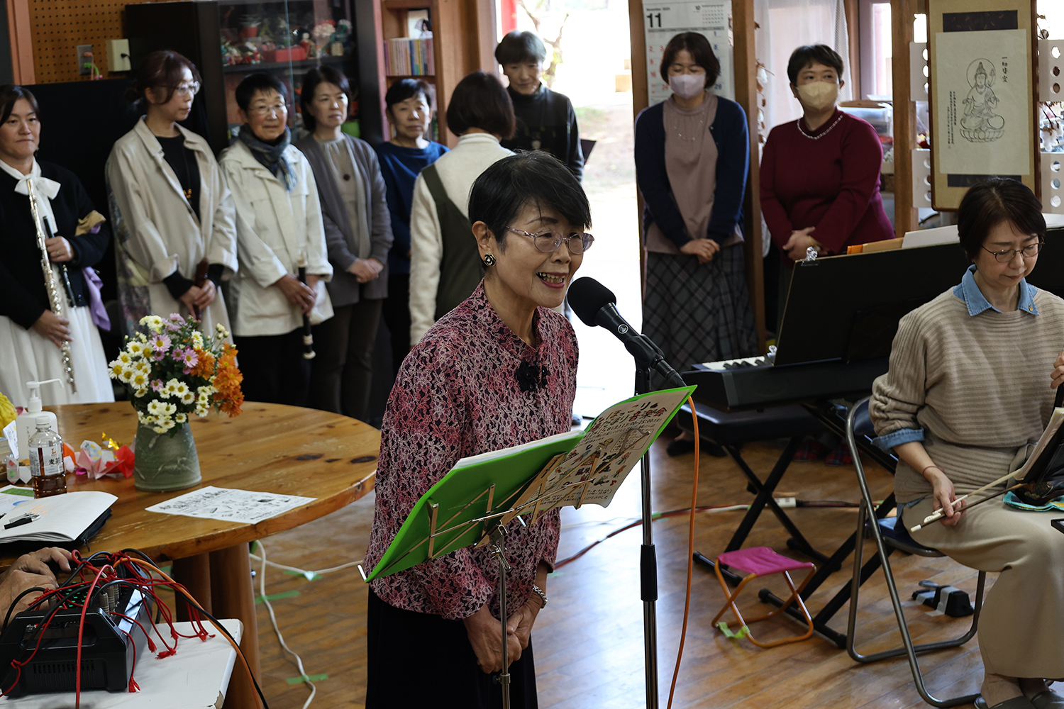 その後、今日演奏していただいた4グループのほかに、音響を担当してくれていた中谷英一郎氏も、ギター演奏で参加し、司会を務めていた沸井美恵子氏はボーカルで、みんなで一緒に歌いましょうというコーナーが始まりました。「秋メドレー(赤とんぼ、旅愁、小さい秋見つけた)」、「秋桜」、「花嫁」、セキ薬局のテーマソング「元気出してよ」、「若者たち」、「学生時代」、最後に「手のひらを太陽に」を、みんなで歌い、終わりました。