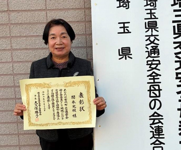 11月19日(水)、さいたま市文化センター(さいたま市南区)にて、令和7年度埼玉県交通安全母親大会が行われ、宮代町交通安全母の会の関永光枝さんが表彰されました。関永さんは、平成29年から令和7年3月まで、宮代町交通安全母の会会長として交通安全啓発活動を行ってきました。この度、その功労が讃えられ受賞となりました。