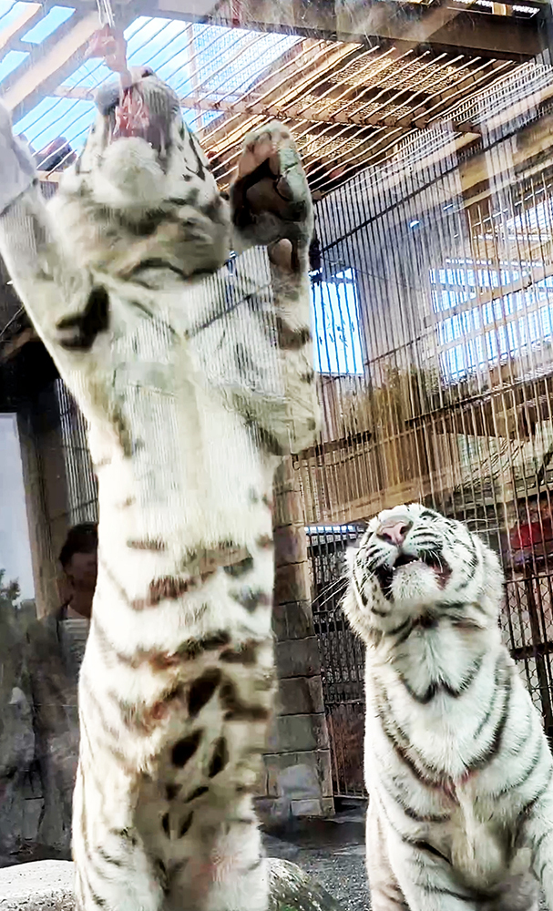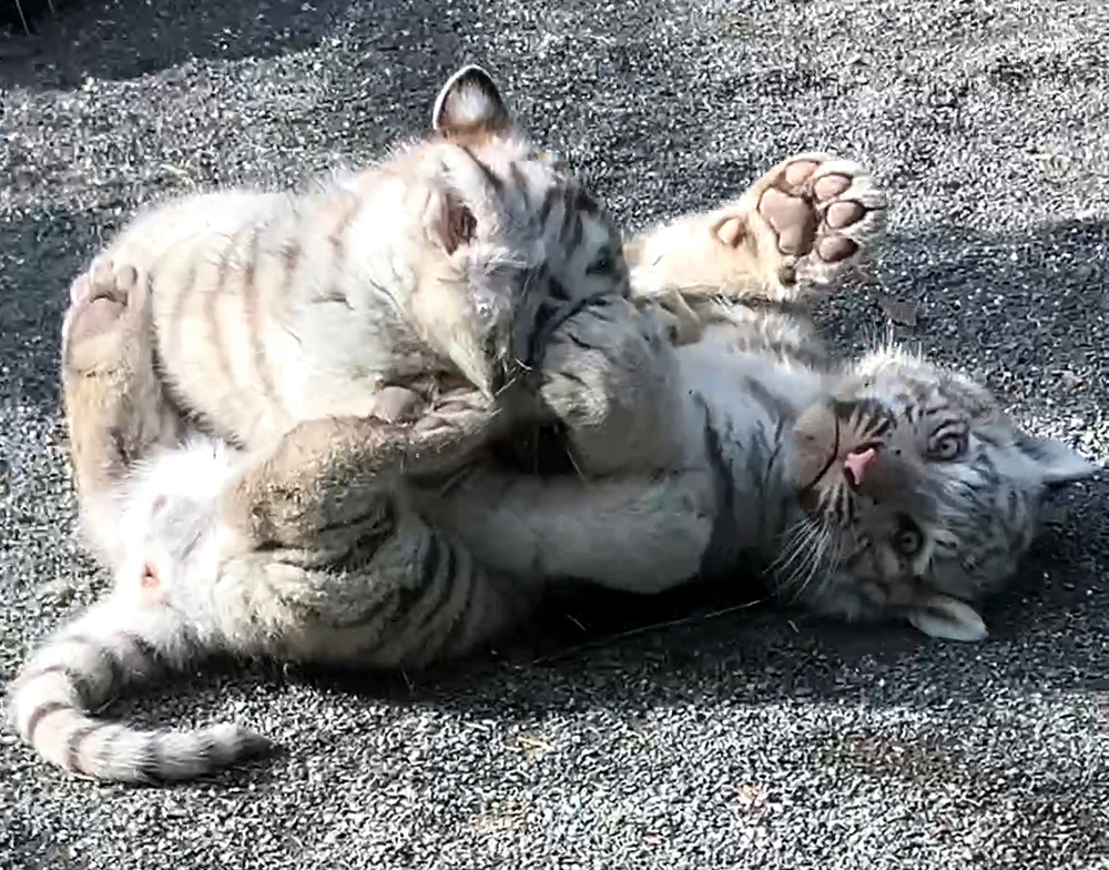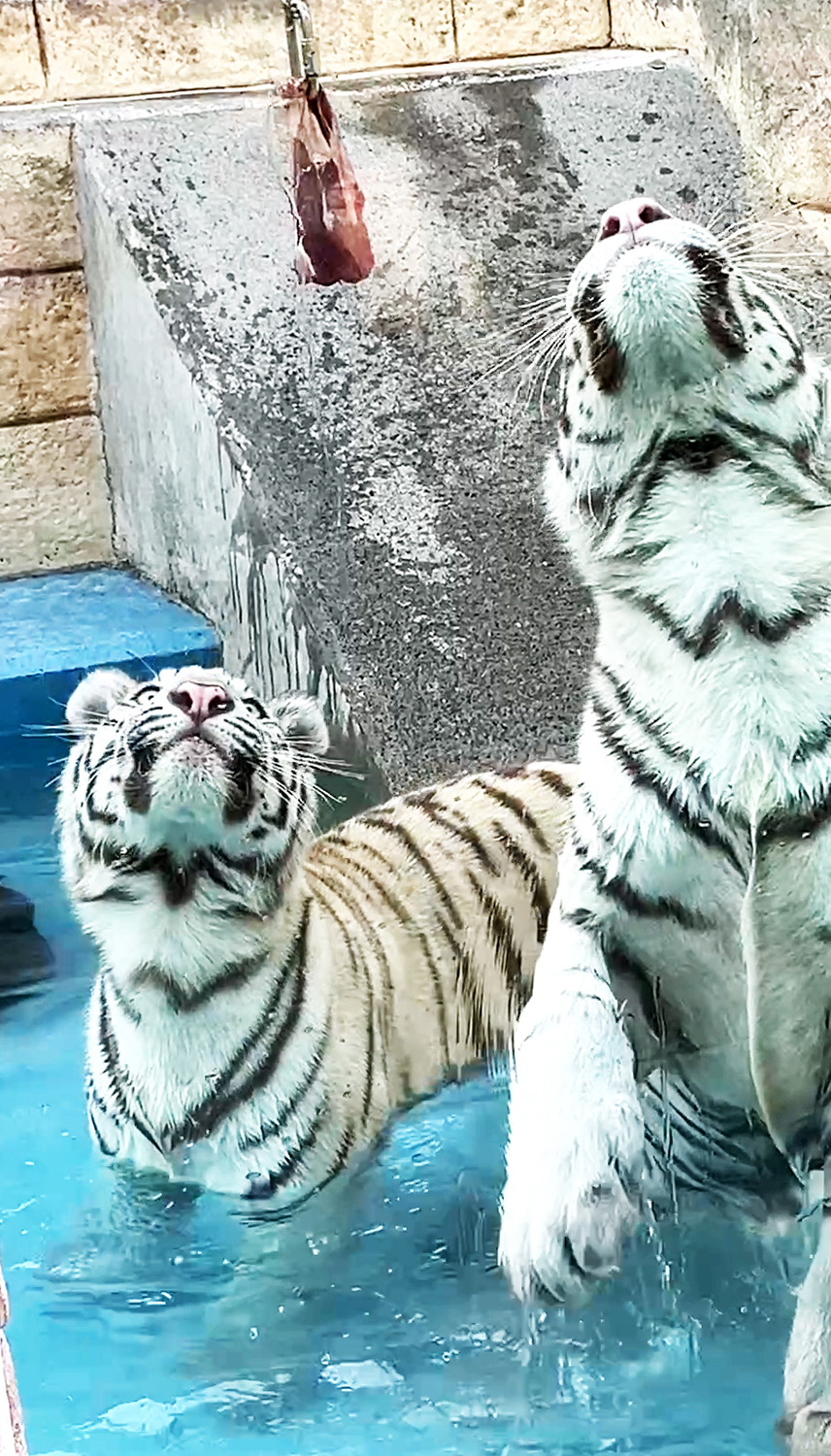 東武動物公園では2025年11月7日にホワイトタイガー・チビとらが1歳の誕生日を迎えました。生まれたては約1キロだった体重も約60キロに増え、たくましくなっています。吊るし肉のキャッチもうまくなって、見学者を喜ばせています。今回、一般公開の始まった1月4日から1歳誕生日の11月7日まで、チビとらの成長の様子を振り返ってみました。