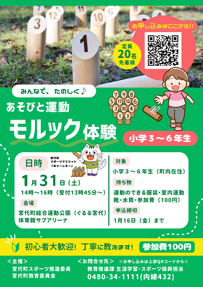 子供たちがさまざまなスポーツ種目を体験することで、スポーツの楽しさと基本を知るとともに、一人ひとりが自分にあったスポーツや興味の持てるスポーツに出会うことを目的に、スポーツ体験イベントを実施します。今回は子どもや初心者でも楽しめるようにつくられた「モルック」を体験してみよう!