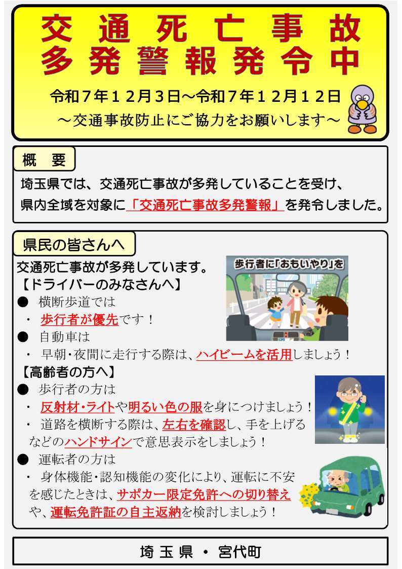 埼玉県では、交通死亡事故が多発していることを受け、令和7年12月3日から令和7年12月12日の間、県内全域を対象に「交通死亡事故多発警報」を発令しました。