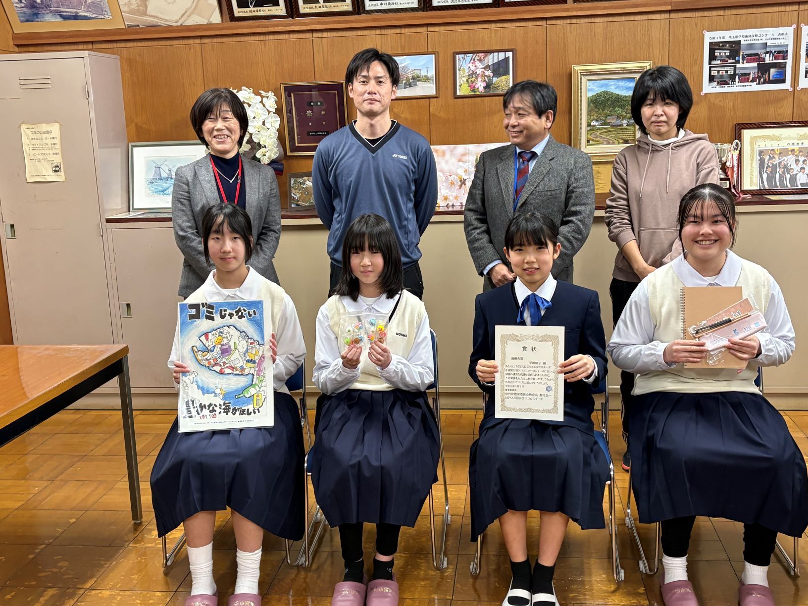 MIYASHIROエコ☆スターズが主催する「第13回エコポスターコンクール」の入賞作品が決定しました。応募があったポスター作品の総数241作品の中から、最優秀賞1点、優秀賞3点、エコ☆スターズ特別賞11点が選出されました。最優秀賞には前原中1年平田桃子(ひらたとうこ)さんが選ばれ、令和8年2月に前原中学校校長室で表彰式が行われました。入賞者には、間伐材を使った無塗装の鉛筆、最後の1ミリまで書けるシャープペンシル、石油を40%しか使わない塩ビのビニールポーチなどが贈呈されました。また、参加賞として、エコに関する商品が贈られました。