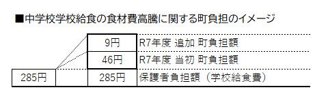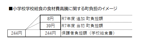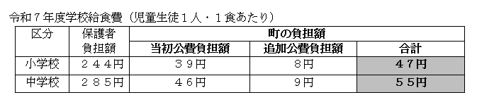 近年、食材価格の高騰が続いている状況を踏まえ、当町では保護者の皆様を経済的に支援するため学校給食費は据え置きとし、公費負担による食材費の補填を行っております。