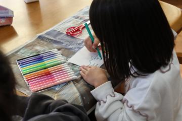 始めは牛乳パックを10センチぐらいに切り、(植木鉢代わり・・・?)そのパックを飾るように貼る紙に、自分の好きな絵や文字などを描き牛乳パックに張り付け、その中にフラワーアレンジ用給水スポンジ(フローラルフォーム)を入れて花を生けていくというもので、見本は無く、自分のイメージで作っていくというものでした。