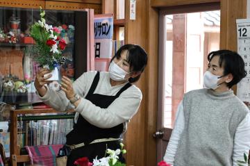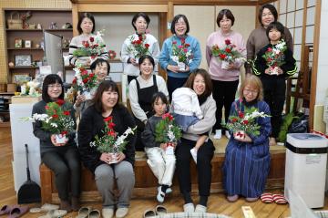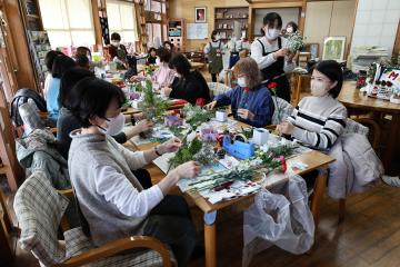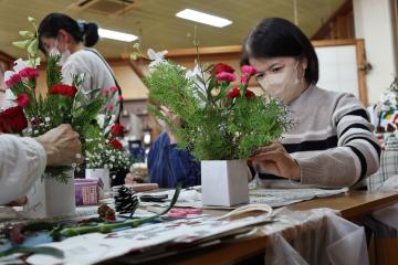 皆さん生けはじめは見本がないので、最初ちょっと戸惑った様子でしたが作り始めると意外と手が早く出来上がり、どなたの作品もとても綺麗でした。どんなイメージで作ったのか聞いてみると、「クリスマス」、「何となくこじんまりしたイメージ」、「華やかなイメージ」ということで、飾る場所は、寒いところで玄関、また、リビングという人がほとんどでした。