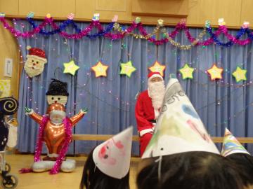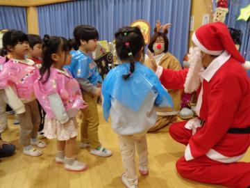 この日をずっと待っていたこども達。クリスマス製作をしたり、衣装を作ったりして指折り数えながら待っていました。ホールで待っていると「シャンシャンシャン…」と鈴の音が聞こえてきて、サンタさんとトナカイさんがソリをひいて登場。大喜びをしていました。