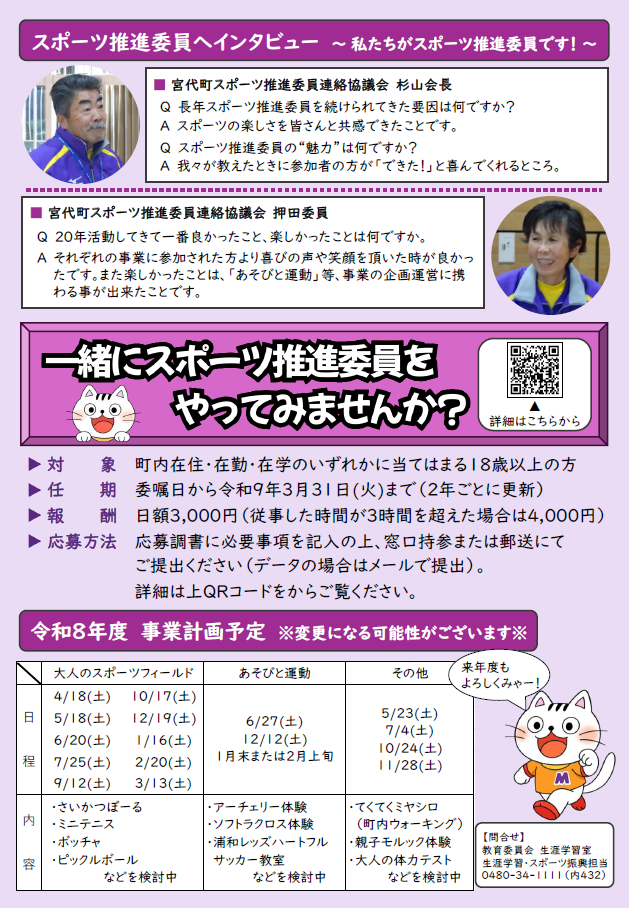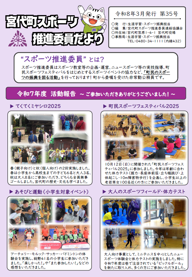 スポーツ推進委員だよりでは、町のスポーツ事業や町民に対するスポーツ実技の指導や助言などを行うスポーツ推進委員の1年間の活動を紹介しております。第35号では、令和7年度の活動報告に加え、スポーツ推進委員の紹介や募集などを取り上げております。ぜひとも、ご一読ください。
