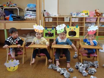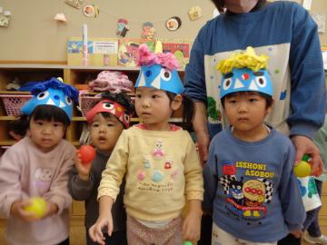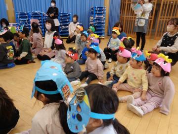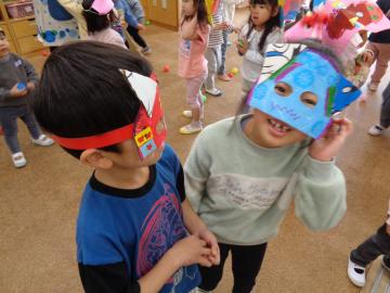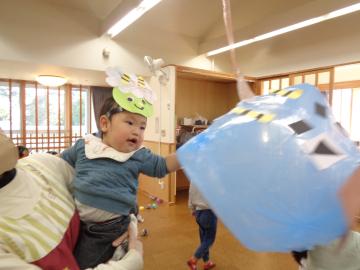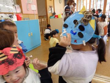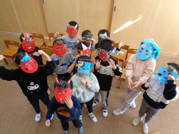 みやしろ保育園では、それぞれのクラスでお面の製作を行い、新聞紙を丸めた特大の豆ボールで豆まきを行いました。年長ぐみは小さいクラスを回って鬼役をしてくれました。