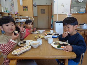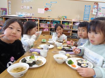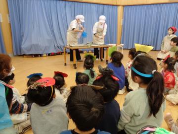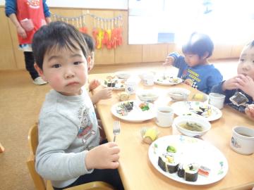 節分と言えば、恵方巻。今日は、給食室から園のホールへ出張して、こども達の前で太巻き作りを実演してくれました。こども達は目を輝かせて見ていましたよ。
