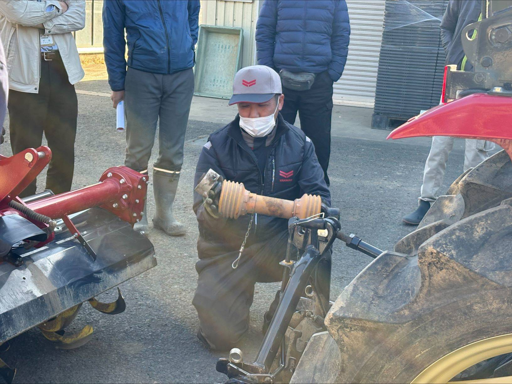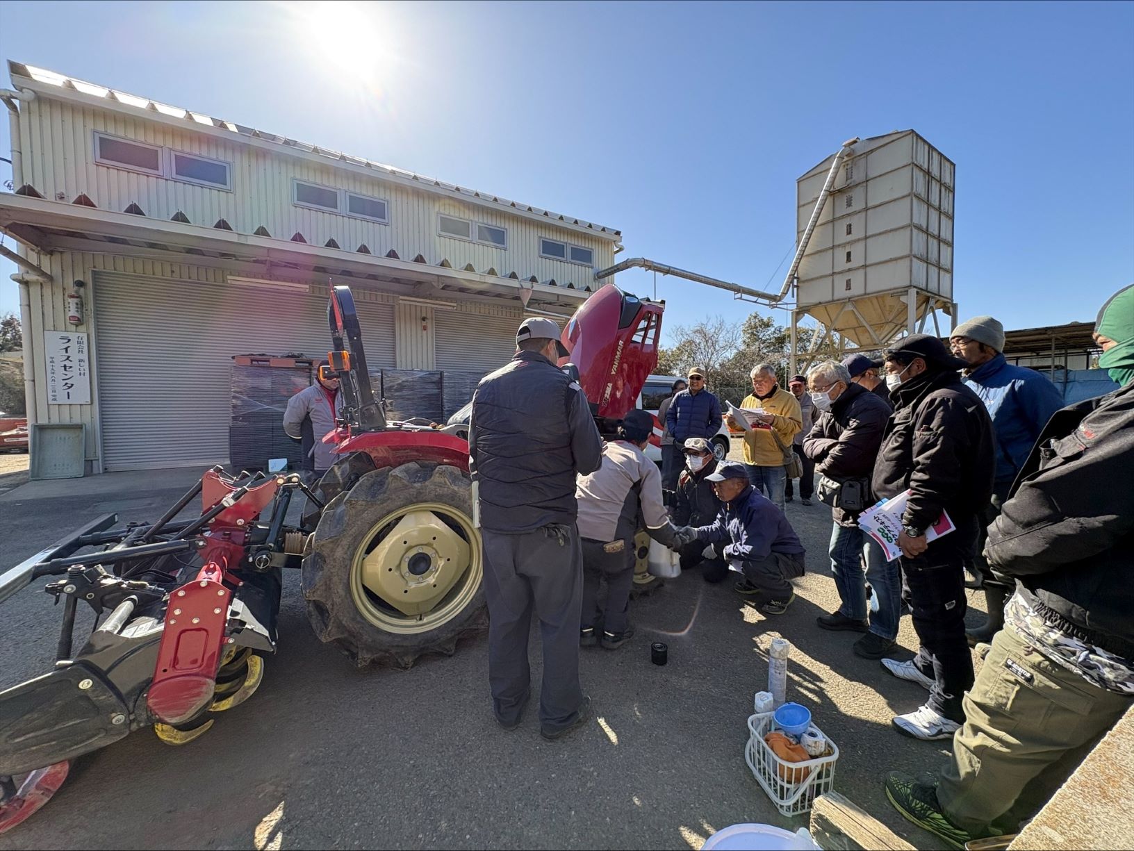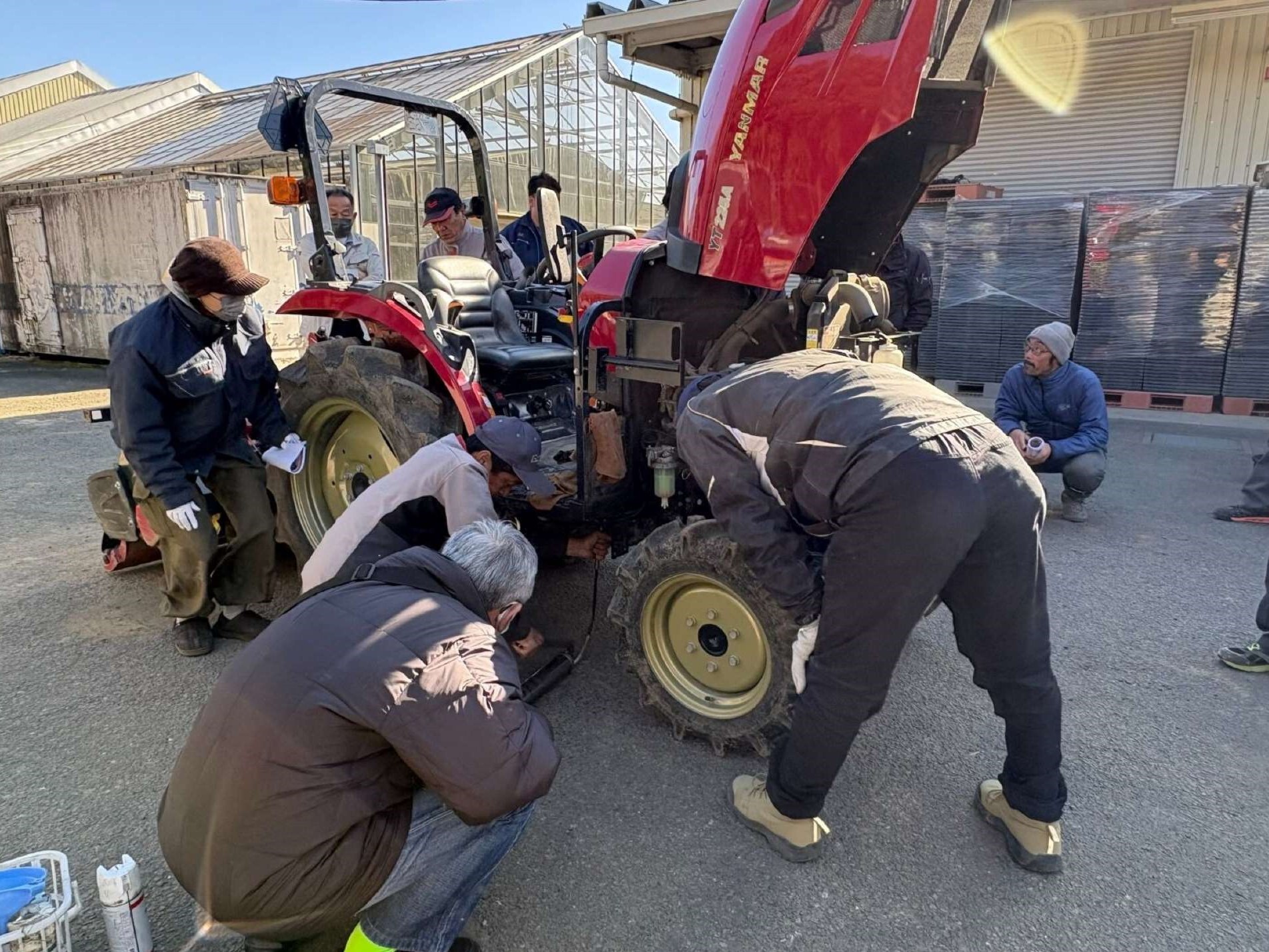 2月19日、新しい村ライスセンターにて「農業機械メンテナンス講座」を開催し、町内担い手農家や新しい村アグリ生産課のスタッフなど9人が参加しました。この講座は、農作業の安全対策と機械トラブルの防止を目的として開催したもので、トラクターの点検・整備方法について学びました。