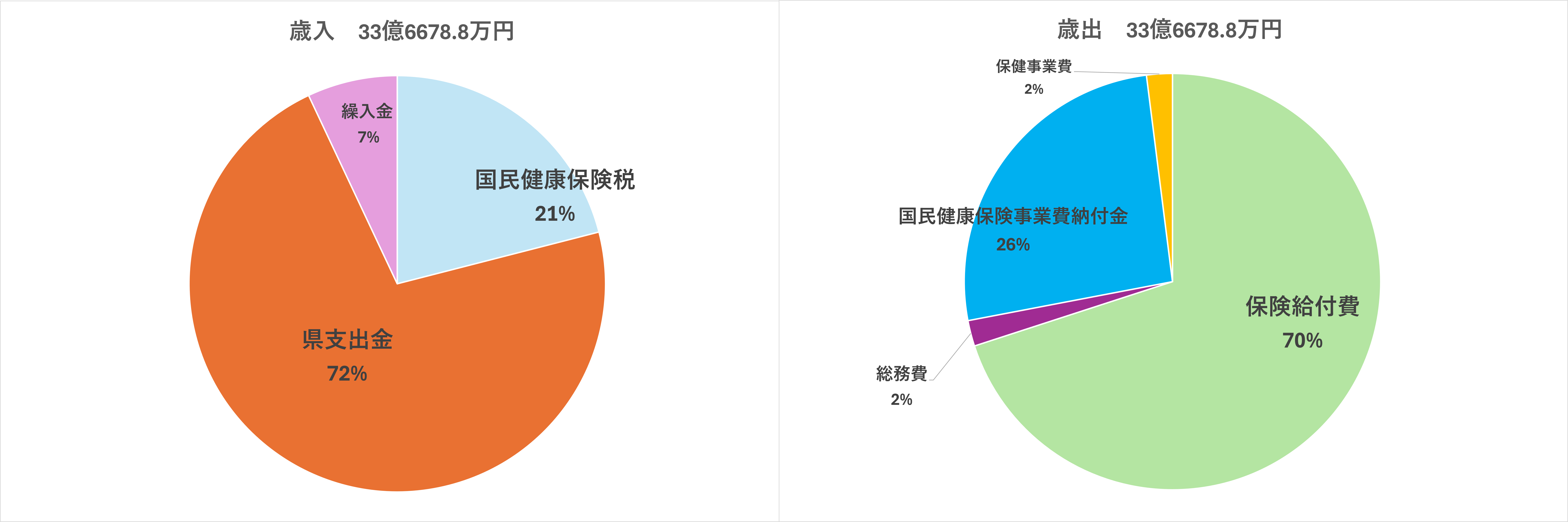 ・歳出については、全体の約70%が保険給付費で医療にかかる費用です。残りの約26%は県に支払う国民健康保険事業費納付金であり、主に、歳入の県支出金の原資となっています。また、残りの2%は保健事業費で、検診などの費用となっています。