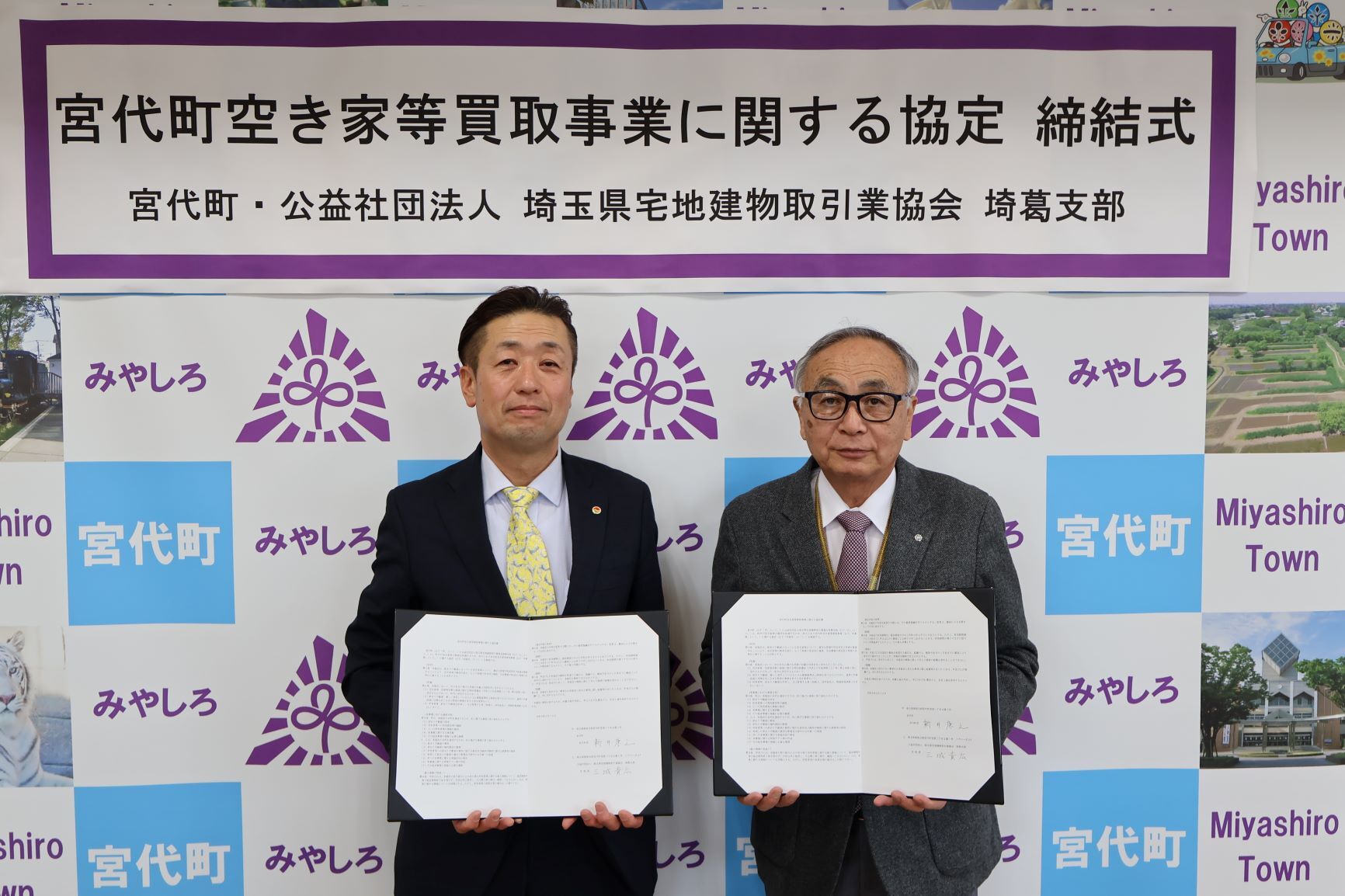 左から、埼玉県宅地建物取引業協会埼葛支部長 三城 貴広 様、宮代町長 新井 康之