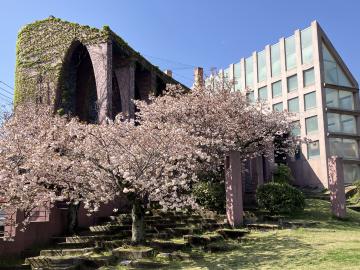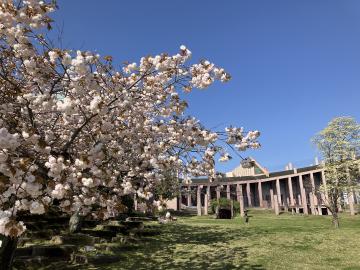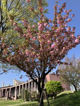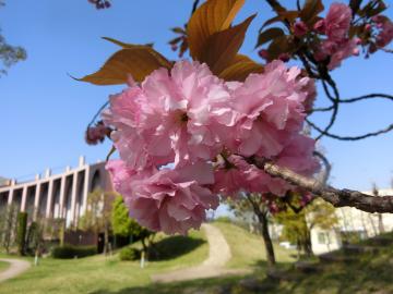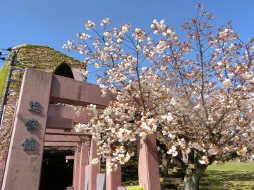 2026年4月11日、暖かな春の盛りになり、進修館へ遅咲き桜「白(うすいピンク)の八重桜:フゲンゾウ(普賢象)」と「濃いピンクの八重桜:カンザン(関山)」の写真を撮りにいきました。満開の桜は青空を背景に、四季の丘の風景に溶け込み、進修館のユニークな建物ともマッチしていました。フゲンゾウは進修館の入口付近にあり、来訪者の多くが足を止めて眺めたり、写真を撮ったりしていました。