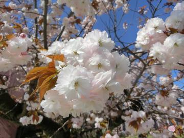 フゲンゾウやカンザンはサトザクラとも言われ、ソメイヨシノ(染井吉野)から1週間ほど遅れて開花します。花弁が20~50枚ほどで、一輪がポンポンのように丸く大きく咲き、そのボリューム感が魅力です。また、ソメイヨシノと異なり、花と同時に葉も出てきます。